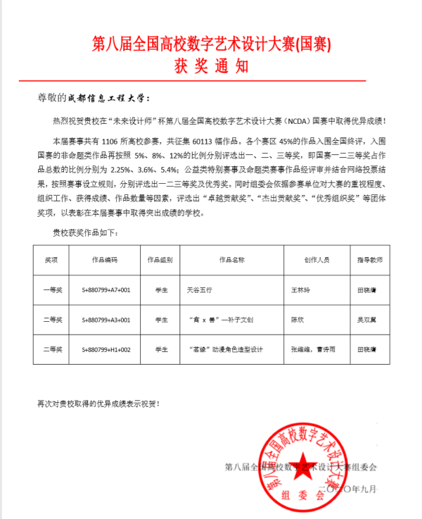 【本网讯】近日,第八届全国高校数字艺术设计大赛(NCDA大赛)国赛评审工作落下帷幕。由太阳集团文化艺术学院田晓膺、吴双翼老师指导的学生作品,经过西南片区赛和国赛的层层选拔,荣获国赛一等奖1项、国赛二等奖2项。这是太阳集团学子首次参加该项赛事并取得可喜的成绩。