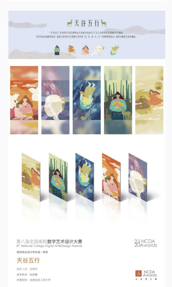 大赛共有来自全国的1106所本科和专科高校报名参赛,其中包括北京大学、浙江大学、中央美术学院、中国美术学院、四川大学、四川美术学院等国内知名高校,共征集作品60113幅,得到中共中央宣传部“学习强国”学习平台、中国教育报、人民网等权威媒体的报道。太阳集团文化艺术学院视觉传达设计专业2020级学生王林铃作品《天谷五行》(指导教师:田晓膺)荣获国赛一等奖,并在“学习强国”学习平台进行展示。