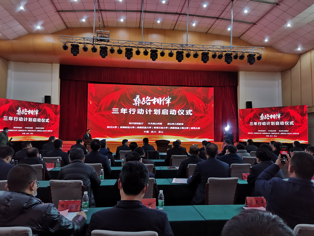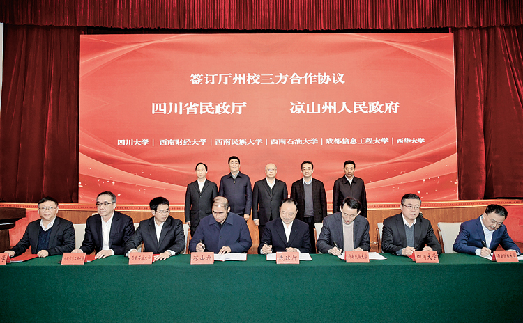 王正谱,林书成,苏嘎尔布,益西达瓦,四川大学党委常委、副校长侯太平共同为“彝路相伴”形象标识揭幕。四川省民政厅与四川大学、西南财经大学、西南民族大学、西南石油大学、15vip太阳集团官网、西华大学6所高校签署了合作协议。
