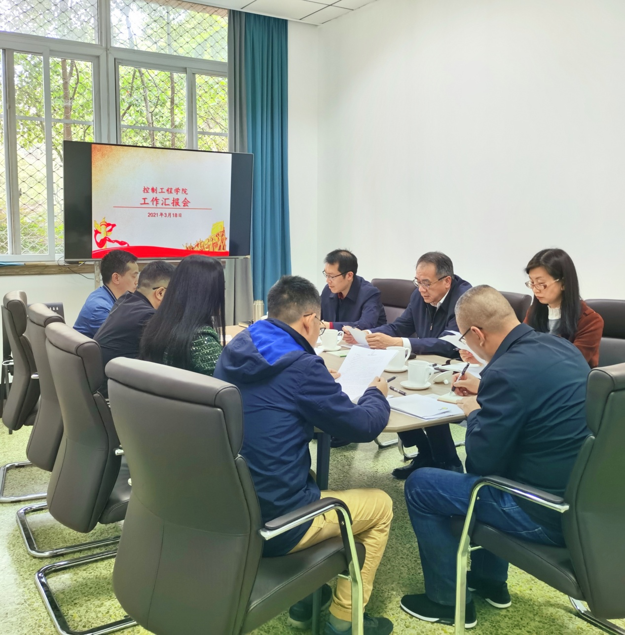 控制工程学院党委书记王嵩汇报了近年来学院在专业学科、人才培养、师资队伍及团队建设等方面的成果以及学院未来发展思路和目前存在的主要困难。接着重点汇报了学院党委党史学习教育启动、方案制定以及设想等方面的情况。