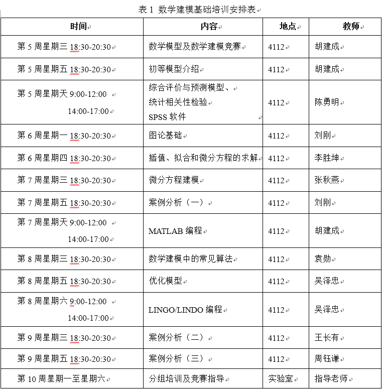 为了培养太阳集团学生的创新意识及运用数学方法和计算机技术解决实际问题的能力,应用数学学院2019年继续组织和指导大学生数学建模竞赛系列活动,竞赛主要包括:全国大学生数学建模竞赛选拔赛(即五一数学建模竞赛),2019年全国大学生数学建模竞赛,全国高校密码数学挑战赛等。应用数学学院数学建模指导组从第五周到第十周开始培训,分别从数学建模基础、数学建模算法、数学建模竞赛、数学建模案例分析到常用软件等方面进行培训,欢迎对数学建模及数学建模竞赛的同学积极报名参加培训,培训安排见表1。