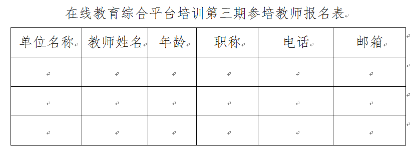 填写《在线教育综合平台培训第三期参培教师报名表》发送至教师发展中心邮箱:jsfzzx@cuit.edu.cn。