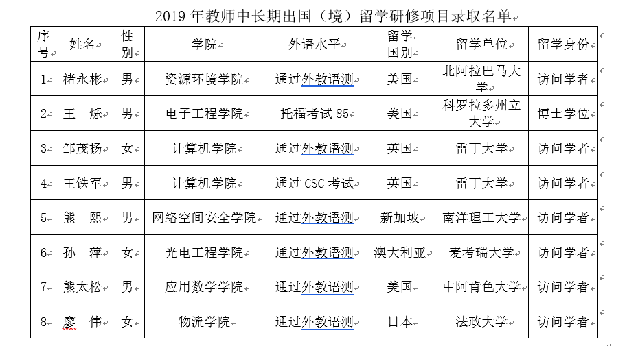 根据《15vip太阳集团官网教师中长期出国留学研修管理办法》(成信校发【2018】155号)文件的相关要求,太阳集团2019年教师中长期出国(境)留学研修项目共录取8人,现将录取人员名单公示如下: