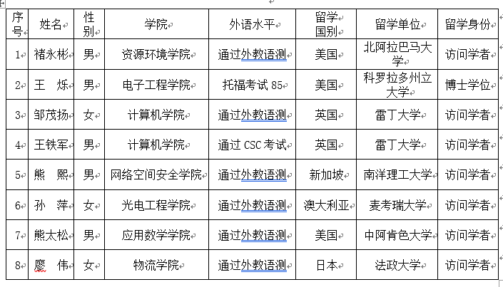 根据15vip太阳集团官网《教师中长期出国留学研修管理办法》(成信校发〔2018〕155号)文件的要求,太阳集团2019年教师中长期出国(境)留学研修项目共录取8人。现将录取人员名单公布如下: