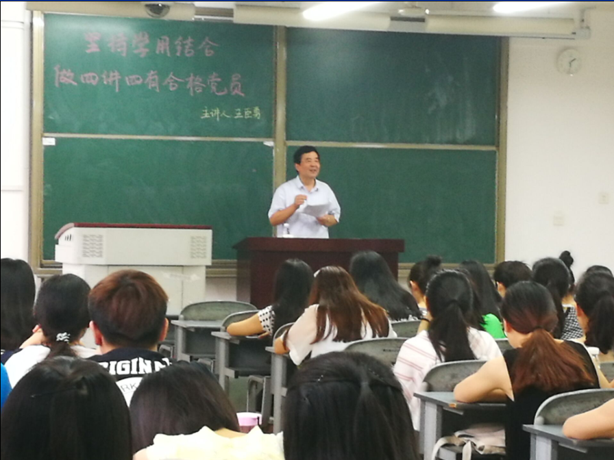 王臣勇老师从认真学习领会习近平总书记系列重要讲话精神、充分认识“两学一做”学习的重要意义、“两学一做”的基本要求和主要任务三个方面,要求学生党员和入党积极分子要对照党员标准,对照“四讲四有”要求,经常检视和改进自己,自觉在思想上政治上同以习近平为总书记的党中央保持高度一致,做政治上的明白人,坚持“学用结合、知行合一、做合格党员”。
