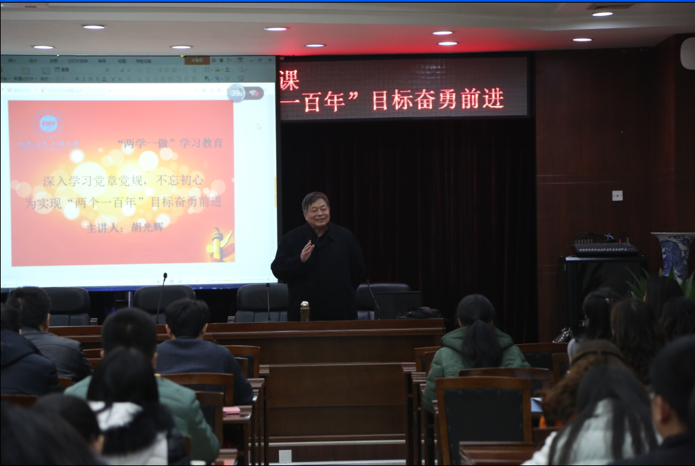 胡光辉以“深入学习党章党规,不忘初心,为实现‘两个一百年’奋斗目标奋勇前进”为题,结合个人体会和当前热点新闻事件,对十八届六中全会、全国高校思想政治工作会议以及全国科技创新大会的精神进行了解读和宣讲。胡光辉从讲述从严治党,加强党员监督,履行党员责任的重要意义入题,希望每一位教师党员通过“两学一做”学习教育,更加坚定理想信念,提高党性觉悟,增强政治意识、大局意识、核心意识、看齐意识,牢记对党和国家的责任;作为高校教师党员,必须做到在党爱党、在党言党、在党忧党、在党为党,按党的教育走好每一步,全方位、全过程、全身心投入到党的教育事业中,在教书育人中去体会幸福,在工作中发挥出党员教师的模范带头作用,努力达到习近平总书记在全国高校思想政治工作会议上提出的“围绕学生、关照学生、服务学生,不断提高学生思想水平、政治觉悟、道德品质、文化素养,让学生成为德才兼备、全面发展的人才”的要求。