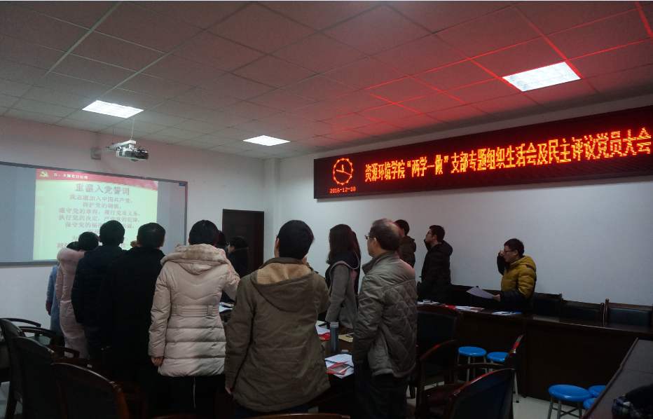 此次党组织生活主要从五个方面展开,一是资源环境学院党总支书记李蕖同志传达上级文件精神;二是“两学一做”第三专题学习研讨;三是“两学一做”党支部专题组织生活会;四是民主评议党员(党员互评);五是主题党日活动-重温入党誓词,签署做合格党员承诺书。会上,参会党员认真严肃的开展了自我批评及互评。通过这次组织生活,各位党员老师深刻的认识到自身存在的问题及不足,为今后的工作指明了方向。