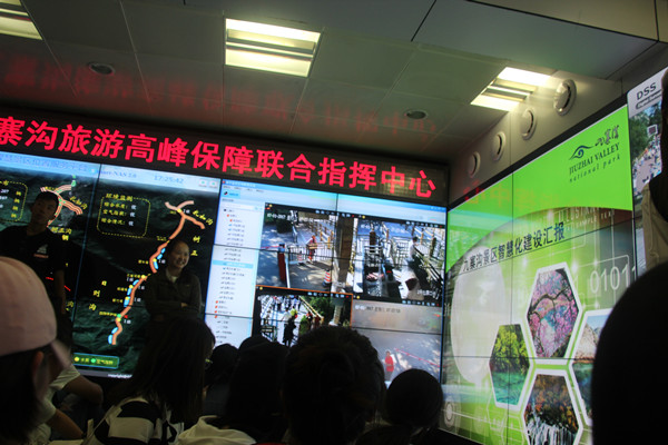 同时,为让同学们借此机会能够了解到九寨沟国家智慧景区示范建设情况,充分认识九寨沟具有的国际管理水平,黄萍教授提前与景区指挥中心取得联系,特地为同学们安排了充分的讲解接待。景区信息中心工作人员在应急指挥管理中心平台专门以PPT展示方式,向师生们解说了九寨沟景区的智慧化建设现状及未来展望,让同学们进一步理解旅游信息化建设的必要性和重要性,同时对旅游信息化支撑了九寨沟景区的精致化管理也具有了深入认识,更激发了大家对智慧旅游、旅游信息化知识探索的兴趣和思考。