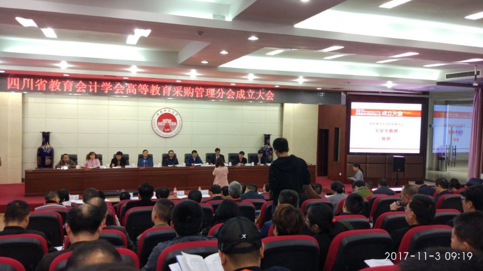【本网讯】11月3至4日,由四川省教育会计学会主办、西华师范大学承办的四川省教育会计学会高等教育采购管理分会(以下简称采购分会)成立大会在西华师范大学华凤校区举行。西华师范大学党委书记王安平,中山大学政府采购与招投标管理中心主任贾延江,四川省教育厅财务管理处处长王羽,北京师范大学财经处处长陆兆老参加会议并作了重要发言。省内共51所高校政府采购主管人员参加会议,太阳集团资产管理处相关人员也参加了本次大会。