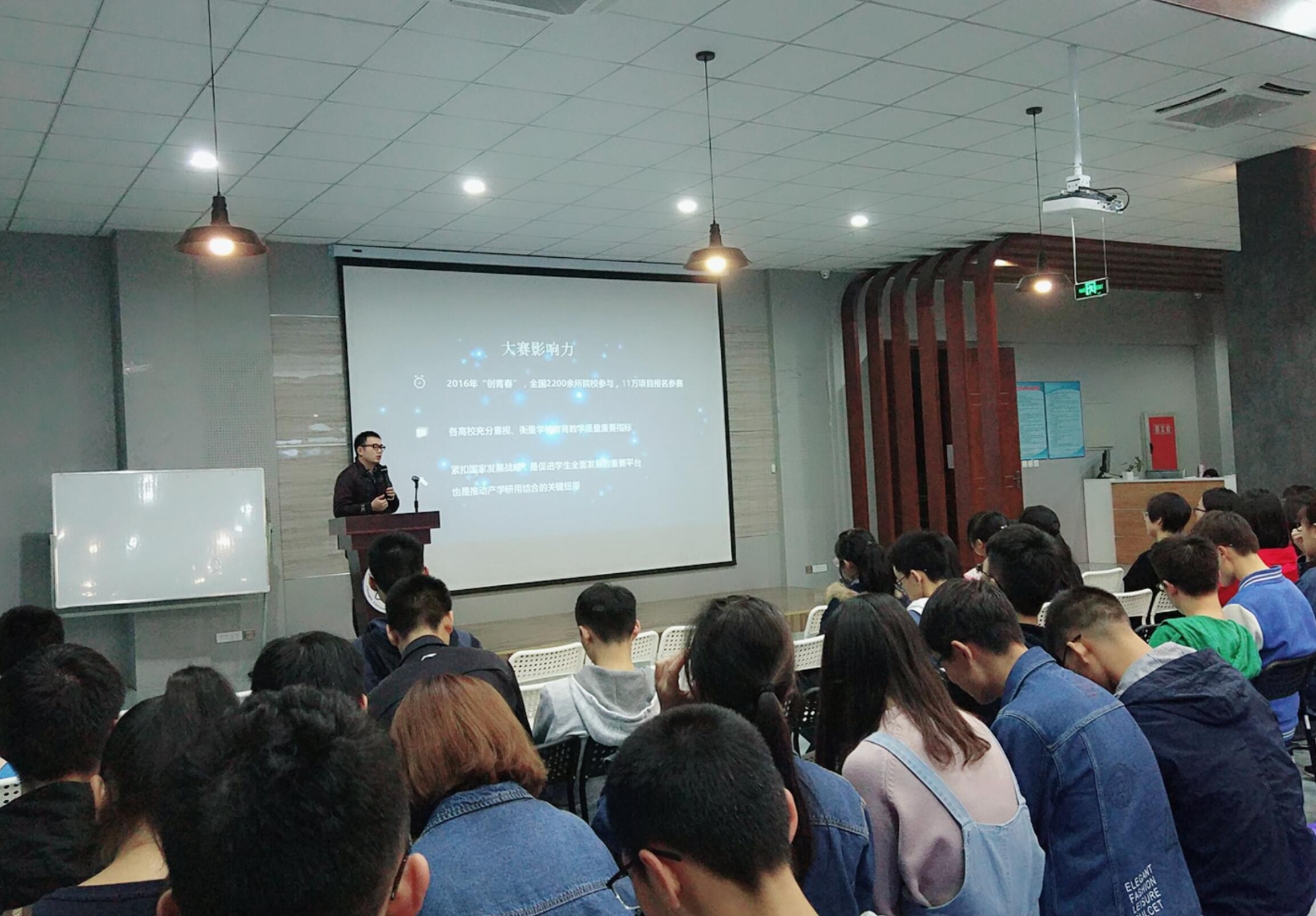 校团委厉威成老师从“创青春”大赛背景、大赛内容、赛程及培训安排、参赛技巧、参赛收获等方面对大赛进行了宣讲和解读。