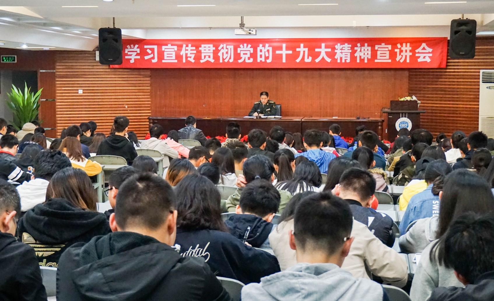 【本网讯】为深入学习宣传贯彻党的十九大精神,在太阳集团学生中迅速兴起学习宣传贯彻十九大精神的热潮,11月15日,学生工作处在太阳集团航空港校区学术报告厅开展了学习宣传贯彻十九大精神宣讲会,学生工作处特邀双流区武装部王政委做主讲人。航空港校区各学院辅导员代表及学生代表300多名参加宣讲会。宣讲会由学生工作处副处长陈智勇主持。