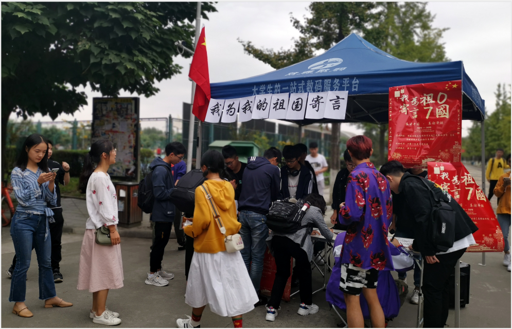 【本网讯】10月7日,为庆祝新中国七十华诞,充分表达广大师生的爱国之情,由图书馆主办,学生益友读书协会承办,不二文学社,麋鹿美食文化俱乐部,曙曦汉韵社,学生茶学协会,学生书画协会与月花语吉他社等六个社团协办,联袂在银杏大道共同举办了“我为我的祖国寄语”活动。