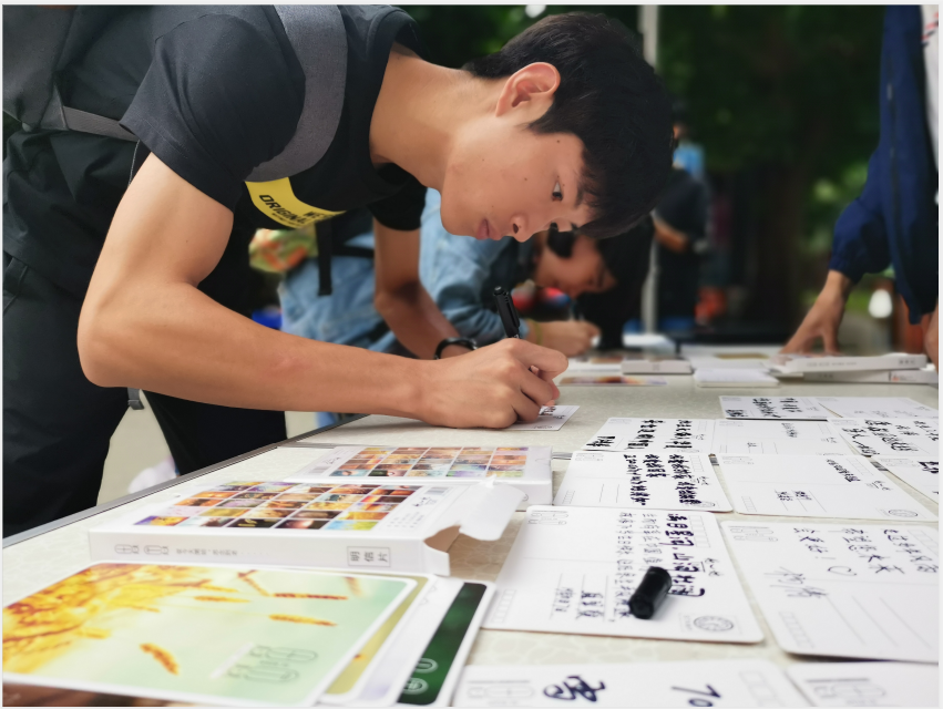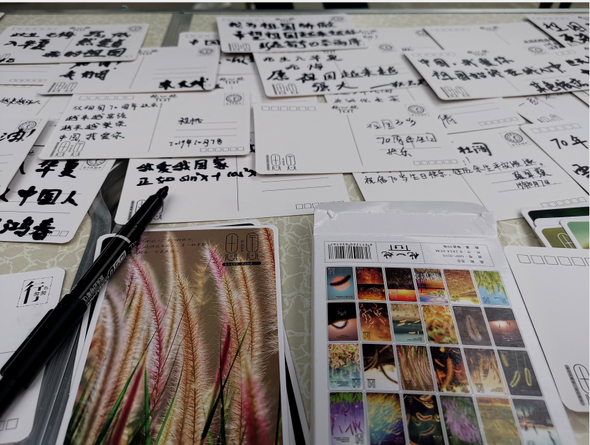 活动于下午5点开始,同学们首先以一曲热情洋溢的“我和我的祖国”拉歌开场,熟悉悠扬的歌声吸引路过的师生、家长以及其他群众纷纷前来,在同学们早已准备的名信片上写下了“此生无悔入华夏!”“我是中国人我骄傲!”等自己对祖国的真心祝福和爱国之情。其中最引人注目和最感动人的是一位70岁高龄的老人和一位拾荒老者的明信片,他们分别写下:“我爱我的祖国,祖国万岁!”“祖国强大了,更希未来强大!”