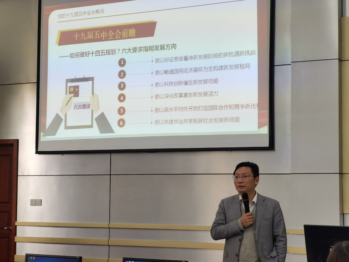 宣讲会上,马洪江深刻阐述了党的十九届五中全会的重大历史意义,从“十三五”期间全面建成小康社会取得的决定性成就、二〇三五年基本实现社会主义现代化远景目标、“十四五”时期经济社会发展指导方针和主要目标、必须遵循的原则等方面全面、系统、深刻解读了十九届五中全会的重点内容。他谈到,习近平总书记在全会上围绕一系列方向性、根本性、战略性的重要问题,创造性地提出了许多新思想新观点新论断新要求,为推动高质量发展,构建新发展格局,夺取全面建设社会主义现代化国家新胜利提供了科学指南和根本遵循。