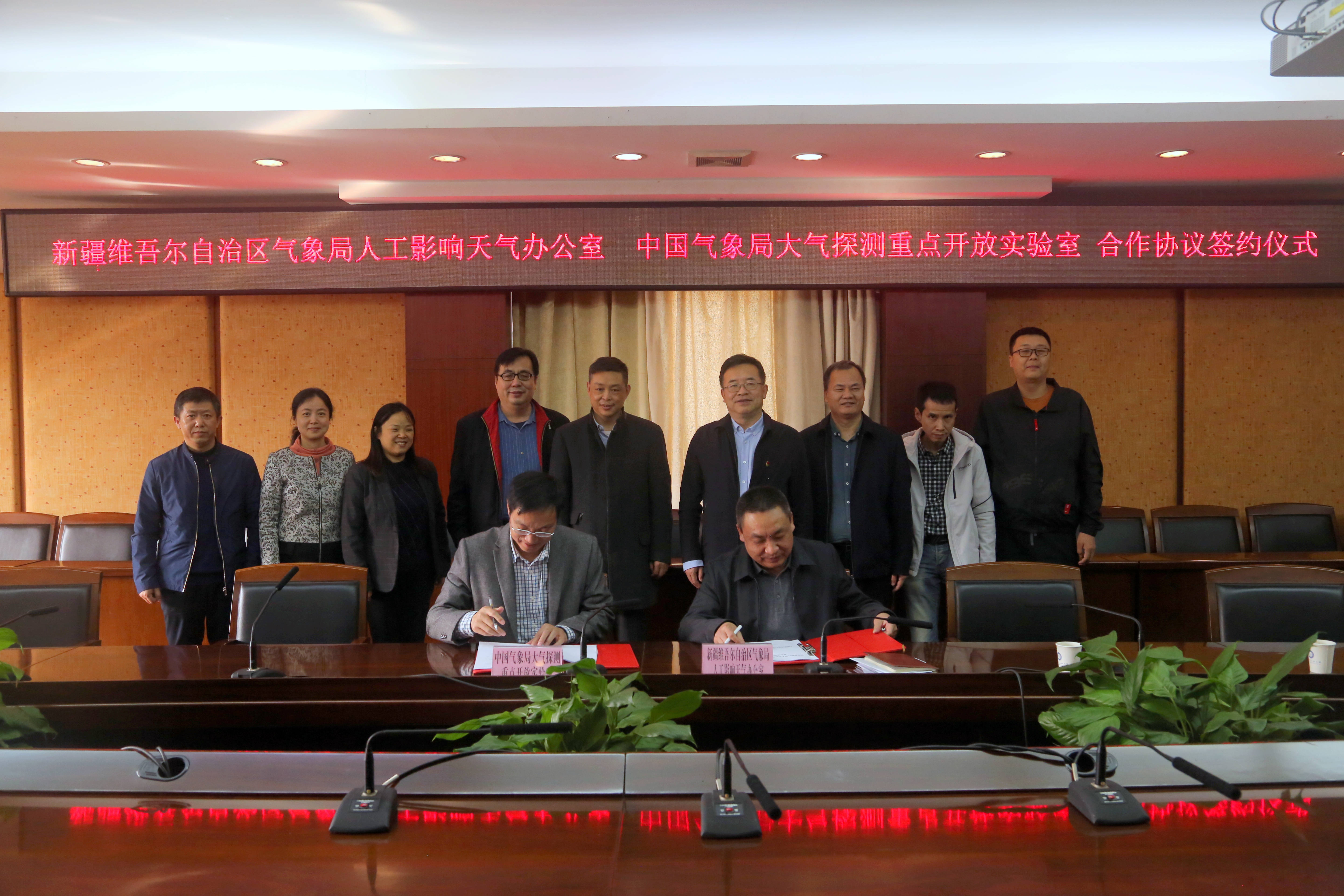 【本网讯】11月20日下午,新疆维吾尔自治区人工影响天气办公室与学校中国气象局大气探测重点开放实验室合作协议签约仪式在行政楼七会议室举行。自治区气象局副局长何清、人工影响天气办公室主任陈胜、太阳集团副校长范广洲参加签字仪式,会议由重点开放实验室常务副主任苏德斌教授主持。