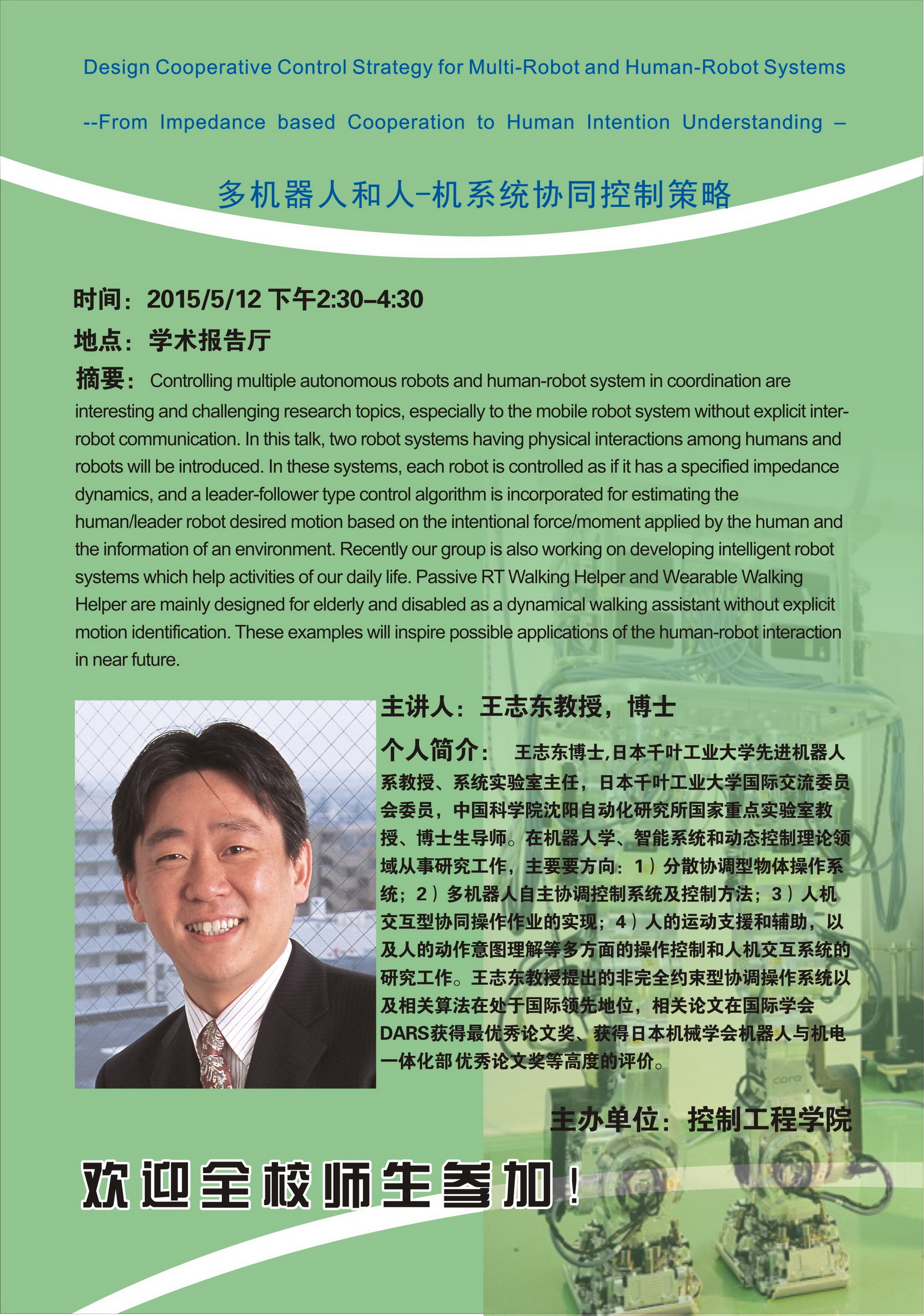 学术讲座预告:多机器人和人机系统协同控制策略