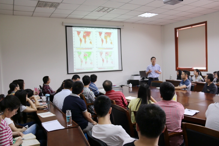 冯松主要围绕干旱对全球变暖的响应,向在座师生深入浅出地介绍了干旱的概念、各种干旱指数以及多种数值模式对干旱区变化的预估,研究结果表明:本世纪末全球干旱区会扩大11%左右,这主要是受到全球变暖的影响而导致蒸发量增加。同时,他简单介绍了他的其它方面研究工作,比如干旱动力学、极地气候变化、干旱归因和贡献等,涉及的内容涵盖基础到学科前沿。此外,他还与在座师生进行了深入的交流和探讨,并表达了与本校师生进一步开展交流合作的希望。