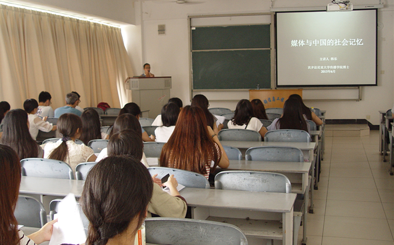 【本网讯】6月19日下午,为了加强国际化的学术交流,培养专业学生对新闻传播学的国际素养,文化艺术学院邀请美国宾夕法尼亚传播学院韩乐博士在龙泉校区第一教学楼1205教室,作了题为“新媒体与中国的社会记忆”的专题学术讲座。讲座由《新闻采访与写作》、《新闻采编实践》课程老师谢明香教授主持。汉语言文学专业2014级全体学生聆听了讲座。