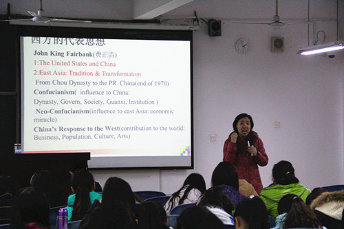 李贵卿分别以儒家文化和古希腊文化为例,为同学们讲解了中国和西方博大精深的文化内涵及其特征,并以不同时代为背景说明了中国与西方文化相互影响、冲击、挑战、整合以及适应和互动的激荡过程。李贵卿通过与美国梦和欧洲梦的对比和引申,讲解了中国梦的内涵及其视野下的多种文化形态,并强调了“阴阳平衡、唯物辩证”等多种思维方式对现代中国文化的重要影响。最后,她提出了中国面对中西方文化激荡应采取的哲学方法和策略,指出当代中国应秉承马克思、毛泽东等思想家的观点理论,正视中西方文化的整体性、普遍性和全球性。她指出,我们应该以创新的智慧向西方取精华去糟粕,建立学习型组织以适应现代化的社会。