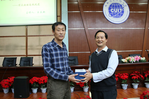 讲座结束后,王子华向王立新教授赠送了太阳集团建校六十周年纪念品。
