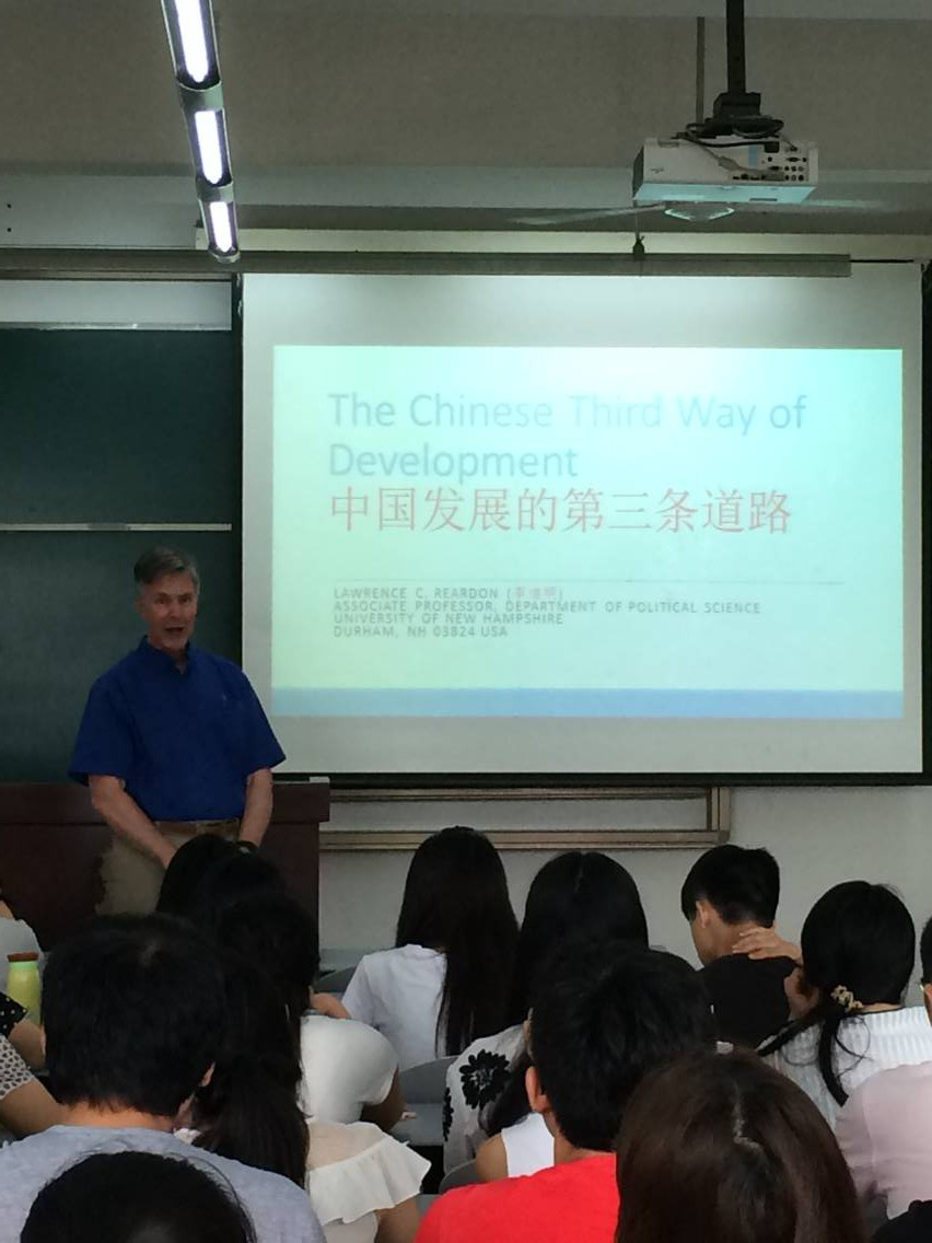 [本网讯]6月23日上午,美国新罕布什尔大学教授系列讲座之“中国发展的第三条道路”在1403教室举行,讲座主讲人为美国新罕布什尔大学政治学院Lawrence C. Reardon副教授。讲座由大气科学学院陈科艺副教授主持,大气科学学院近百名师生参加了此次讲座。
