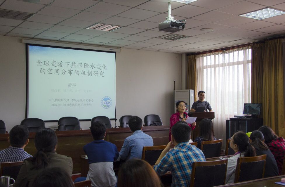 【本网讯】9月20日上午,中国科学院大气物理研究所季风系统研究中心黄平研究员应我院邀请,在气象楼215会议室做了题为“全球变暖下热带降水变化的空间分布和机制研究”的学术讲座,讲座由朱克云教授主持。大气科学学院部分教师和研究生参加了此次讲座。