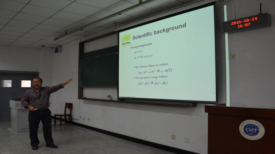 【本网讯】10月14日下午,英国气象局Hadley中心武培立教授应大气科学学院邀请,在1301教室做题为“Precipitation Response in Warming Climate”的学术讲座,讲座由吕世华教授主持。大气科学学院部分教师和研究生参加了此次讲座。