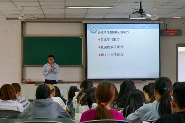 【本网讯】4月18日下午,电子科技大学外国语学院副院长胡杰辉教授应邀到太阳集团参加“2017国际人才英语考试(ETIC)”宣讲活动,并作了题为《打造外语学习者的核心竞争力》的专题讲座。