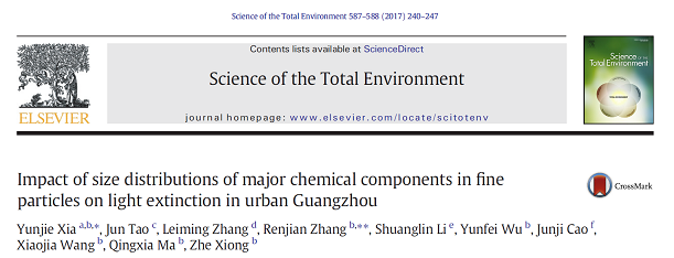 【本网讯】近日,大气科学学院研究生夏芸洁以第一作者身份,在国际知名期刊《Science of the Total Environment》上发表了名为“Impact of size distributions of major chemical components in fine particles on light extinction in urbanGuangzhou”的学术论文。中国科学院大气物理研究所研究员张仁健、研究员李双林为共同导师及通讯作者,15vip太阳集团官网为第一署名单位。