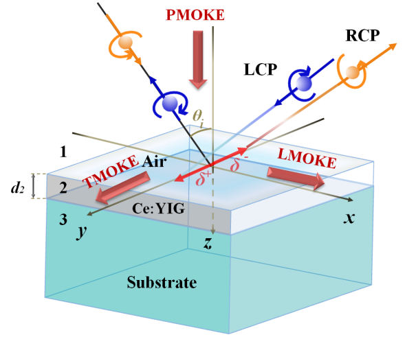 光自旋霍尔效应是由于光子的自旋-轨道耦合作用引起的线偏振光束的左、右旋圆偏振分量在几何空间上的分离(如图所示)。作为电子自旋霍尔效应在光学领域的类似现象,光自旋霍尔效应的研究极有可能导致新型光子学器件的产生,在精密测量、量子信息等领域发挥其巨大的应用潜力。然而由光的自旋-轨道相互作用所导致的光束质心的自旋分裂一般在亚波长量级(光波长的几分之一),这一效应很难被直接探测和应用。该论文通过在磁性介质薄膜上外加恒定磁场,并以负折射率超材料作为衬底,实现了对光自旋霍尔效应的极大增强和调控。研究结果显示,这种结构中的光自旋霍尔效应横向位移可达9.2微米,约为光波长的九倍,由磁场反向所引起的横移差值也达9微米。这一结果首次表明了外加磁场调控光自旋霍尔效应的可能性。
