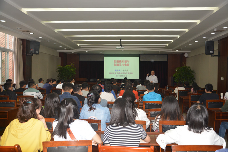 【本网讯】9月25日下午,常州大学信息科学与工程学院包伯成教授应学校通信工程学院邀请,在行政楼第一会议室作了关于《忆阻模拟器与忆阻混沌电路》的学术报告,通信工程学院部分师生参加了此次学术交流。报告由学院院长李英祥主持。