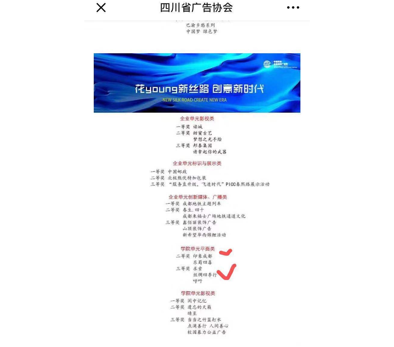 【本网讯】3月19日,首届中国西部丝路国际广告大赛在成都世纪城天堂洲际大酒店天府厅落下帷幕。 在指导老师向伶梅、田晓膺的带领下,太阳集团文化艺术学院视觉传达设计2017级学生徐嘉仪、蒋璐、闫稳旭、邓家苗的作品《印象成都》荣获平面类二等奖;2015级学生贾萍萍的作品《丝绸四季行》荣获平面类三等奖。