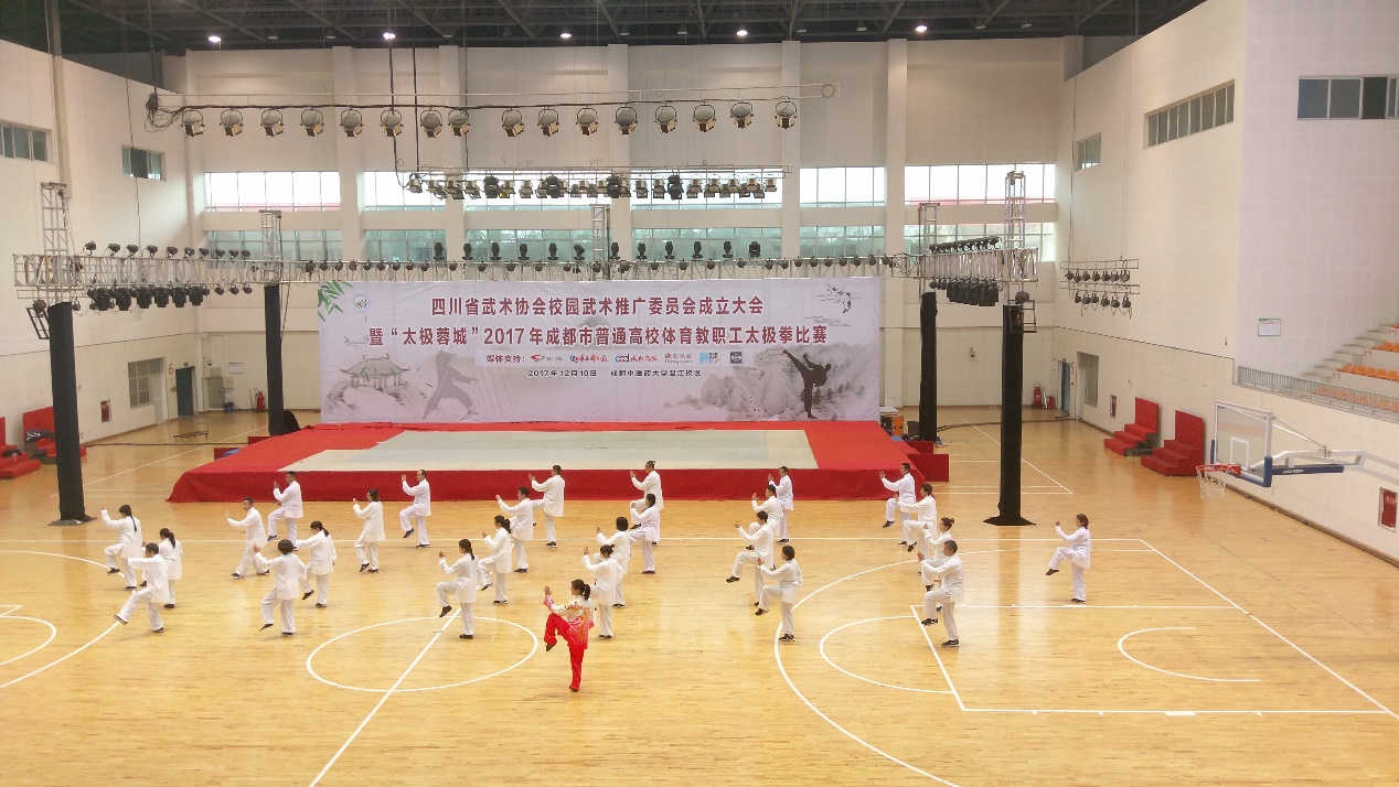 【本网讯】12月10日上午,由成都市体育局、成都市高校体协主办,成都市武术跆拳道运动管理中心、成都市武术运动协会、成都中医药大学承办的“太极蓉城”2017年成都市普通高校体育教职工太极拳比赛在成都中医药大学温江校区体育馆举行。